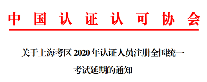按照沪肺炎防控办[2020]245 号《关于印发<上海市集会类活动新冠肺炎疫情常态化防控工作指导意见>的通知》要求,依据考点所在地相关部门意见,中国认证认可协会决定,原定 11 月 7-8 日举行的 2020 年认证人员注册统一考试上海考区考试延期举办。现将有关事项通知如下: